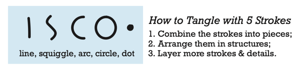 For making repeatable patterns and “tangles” we combine the ISCO. marks into elements that we can use to fill a space. Use your imagination to put together any two marks. Then try building a different element using three marks. Try the first two marks again in a new way. There are endless combinations.