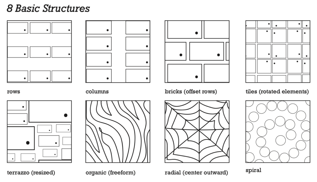 When filling a frame with combinations of ISCO. marks, you can choose a structure to make everything neat and repeatable. You might arrange your elements in rows, or maybe you spiral them, or arrange them like tiles.